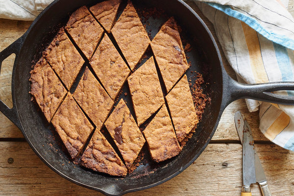 The original recipe for these buttery, basic toffee bars belongs to Maida Heatter, the great American dessert maven of the 20th century. It was adapted for a cast- iron skillet by Charlotte Druckman, who wrote a book on cast-iron baking in 2016. “You can caramelize a crust in cast iron in a way that would never happen in a sheet pan,” she said. Make sure to bake the bars until very well browned across the top; that is the sign that the desired level of crisp chewiness has been achieved. The recipe calls for adding either nuts or chocolate to dough; you can add both if you like, but in that case use a larger cast-iron skillet (or use a plain old 9-by-13-inch baking pan).