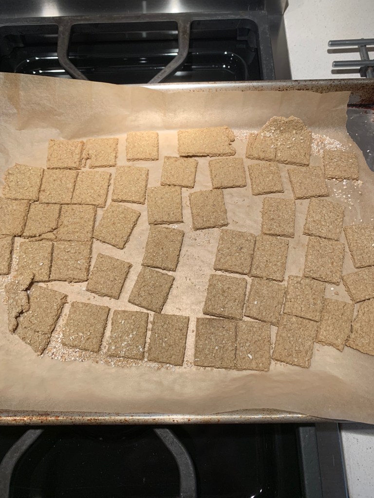 Turn the dough onto a piece of parchment large enough to fit a cookie sheet, and form into a rough rectangle. Flour the top of the dough to keep it from sticking to a rolling pin, and roll the dough out to 1/8″ to 1/4″ thickness. There is no need to flour the parchment paper, the crackers will release from the paper as they bake. Using a knife, cut the rolled dough into 2″ squares, without cutting the parchment paper. Transfer the crackers to a cookie sheet using the parchment paper to slide the dough onto the cookie sheet. Place the sheet in the middle of a 325 degree oven. The crackers should bake slowly, and check them after 20 minutes. They will lose their doughy-ness, and will feel firm when done. Keep checking every 5 minutes, and they should be done after 30-35 minutes.