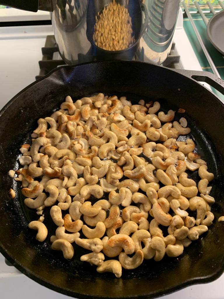 This recipe is great for a quick appetizer or snack- it takes less than ten minutes on the stove top, then toss the nuts with the spices, herbs and salt, and you’re done. The title says cashews, but walnuts work very well, or a combination of whatever raw nuts you have on hand. The mix ingredients can be modified, more or less salt, chili powder etc.
