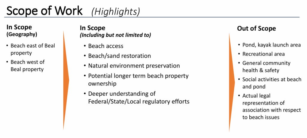 The team recommends taking no significant action at this time, noting that expert feedback on the value of potential interventions has been mixed. However, to properly assess the feasibility of a broad dune restoration, hiring a private consultant—estimated at around $30,000—could be considered. Should the membership express interest, this path remains open, though it would require a substantial funding effort. The team remains flexible and open to future actions as perspectives and beach conditions continue to evolve.